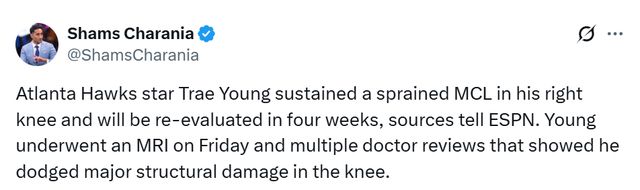 北京時(shí)間11月2日,據(jù)名記Shams報(bào)道,消息人士向ESPN透露,亞特蘭大老鷹隊(duì)球星特雷-楊右膝內(nèi)側(cè)副韌帶扭傷,四周後將接受復(fù)查。楊已於昨日完成核磁共振檢查,經(jīng)多位醫(yī)生會(huì)診確認(rèn),其膝蓋未出現(xiàn)重大結(jié)構(gòu)性損傷。