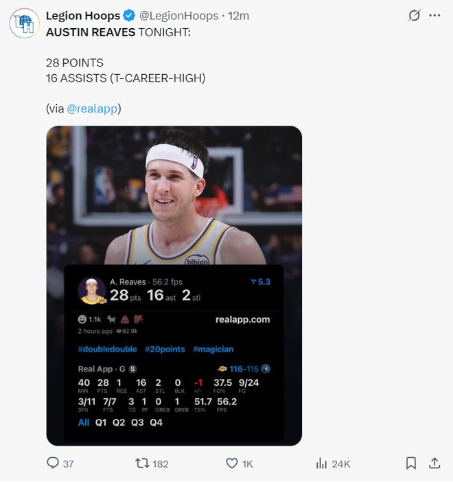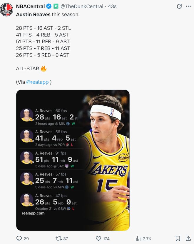 湖人官方發(fā)瞭一個(gè)奧斯汀-裡夫斯的名字。