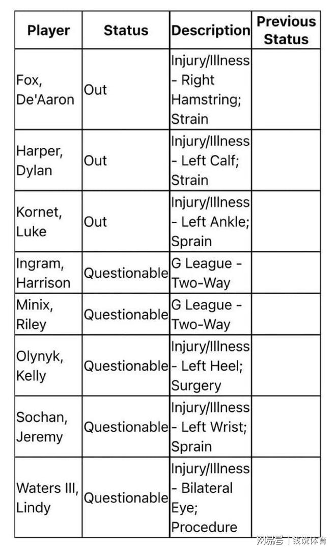 馬刺方面的傷病情況同樣不容樂觀,球隊(duì)已有3名球員確定缺席,分別是福克斯、榜眼秀哈珀以及科內(nèi)特,其中哈珀是新晉傷病球員,此次因左小腿拉傷無法登場(chǎng),他的缺席將影響馬刺的年輕陣容輪換。更值得註意的是,馬刺還有5名球員處?kù)丁俺鰬?zhàn)成疑”狀態(tài),包括英格拉姆、米尼克斯、奧利尼克、索漢和沃特斯,這5名球員的出戰(zhàn)情況將直接決定馬刺本場(chǎng)的陣容厚度。