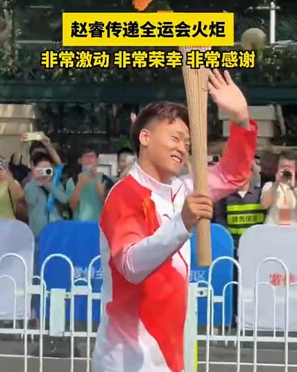 趙睿穿著全運(yùn)會運(yùn)動服,右手高舉火炬奔跑完成傳遞,並且揮手向觀眾示意。