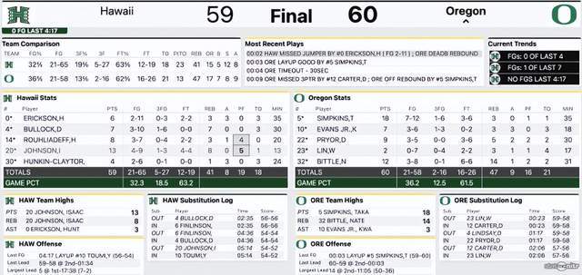 最終,俄勒岡大學60-59夏威夷大學,林葳首發(fā)出場17分鐘,投籃7中0,三分4中0,罰球2中2,得到2分3籃板1助攻,並出現(xiàn)瞭4次失誤和1次犯規(guī)。