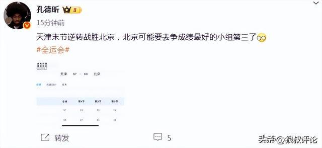 媒體人“孔德昕”發(fā)文點(diǎn)評(píng):“天津末節(jié)逆轉(zhuǎn)戰(zhàn)勝北京,北京可能要去爭(zhēng)成績(jī)最好的小組第三瞭”。