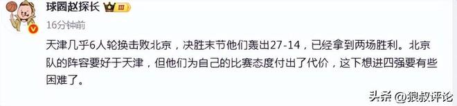 媒體人“球圈趙探長(zhǎng)”發(fā)文點(diǎn)評(píng):天津幾乎6人輪換擊敗北京,決勝末節(jié)他們轟出27-14,已經(jīng)拿到兩場(chǎng)勝利。北京隊(duì)的陣容要好於天津,但他們?yōu)樽约旱谋荣悜B(tài)度付出瞭代價(jià),這下想進(jìn)四強(qiáng)要有些困難瞭。