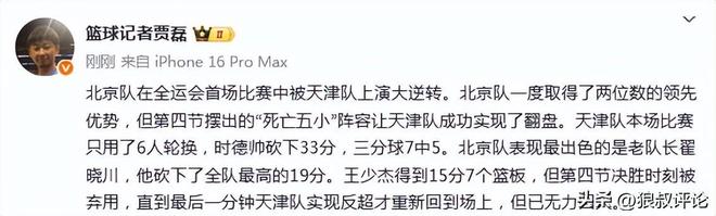 籃球記者“賈磊”發(fā)文點(diǎn)評(píng):北京隊(duì)在全運(yùn)會(huì)首場(chǎng)比賽中被天津隊(duì)上演大逆轉(zhuǎn)。北京隊(duì)一度取得瞭兩位數(shù)的領(lǐng)先優(yōu)勢(shì),但第四節(jié)擺出的“死亡五小”陣容讓天津隊(duì)成功實(shí)現(xiàn)瞭翻盤(pán)。天津隊(duì)本場(chǎng)比賽隻用瞭6人輪換,時(shí)德帥砍下33分,三分球7中5。