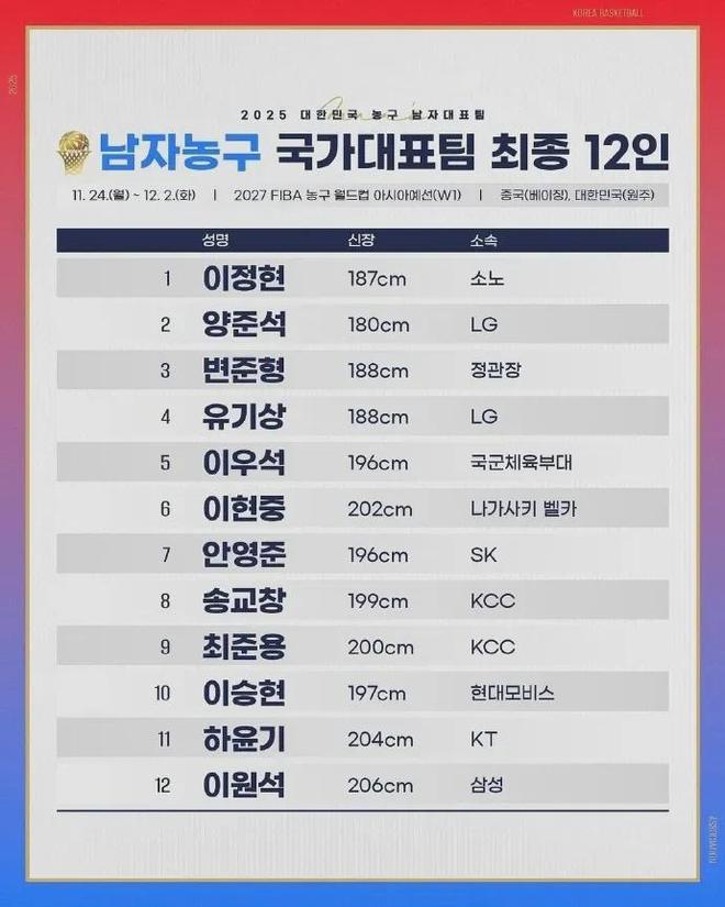 對瞭,韓國男籃已經(jīng)公佈瞭出戰(zhàn)世預(yù)賽的12人大名單,由李賢重領(lǐng)銜。