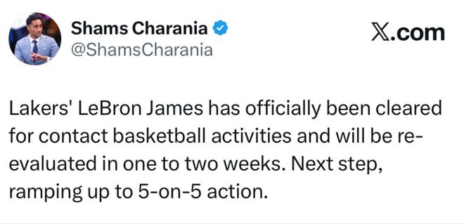 今天,來自Shams的權(quán)威消息,詹姆斯已獲準參加5VS對抗訓練,1-2周後將重新評估傷情。
