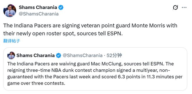 北京時間11月7日,據(jù)名記Shams報道,步行者隊(duì)將裁掉麥克朗,並簽下蒙特-莫裡斯。步行者隊(duì)記Dopirak透露,莫裡斯將簽下一份為期一年的非保障合同。