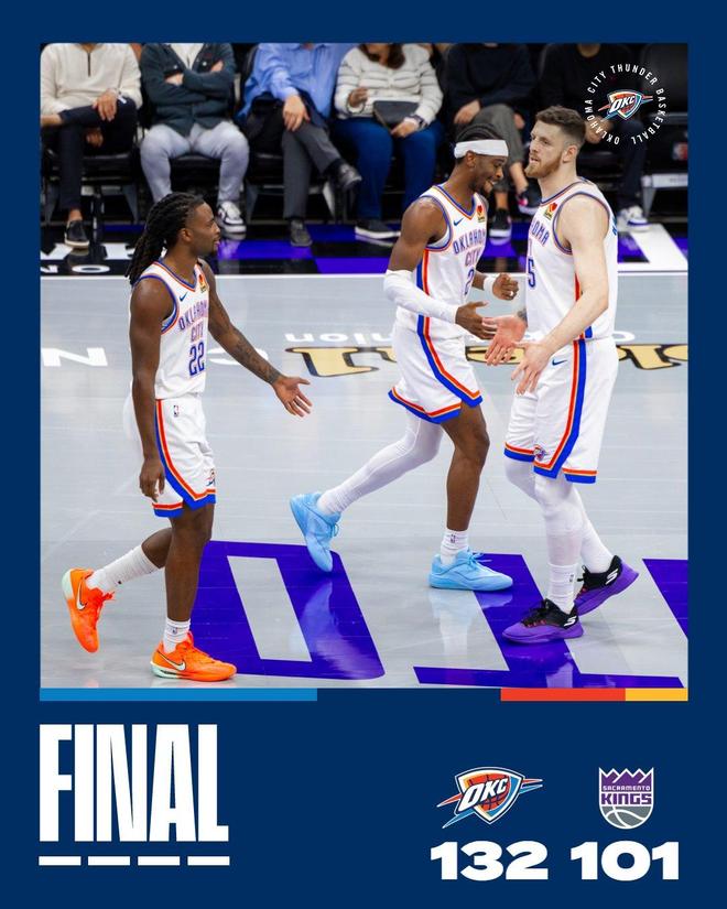 第4節(jié),米切爾連續(xù)送出助攻,OKC依靠著團隊作戰(zhàn),得以將分差擴大至34分,比賽早早失去瞭懸念。薩克拉門托追分乏力,最終,雷霆以132比101完勝對手。