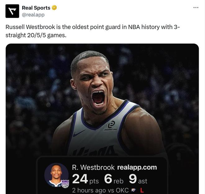 此役,威少還創(chuàng)下瞭紀錄。數據顯示,威少已經連續(xù)三場砍下至少20分5板5助攻,為做到這點歷史最老後衛(wèi)(36歲361天)。