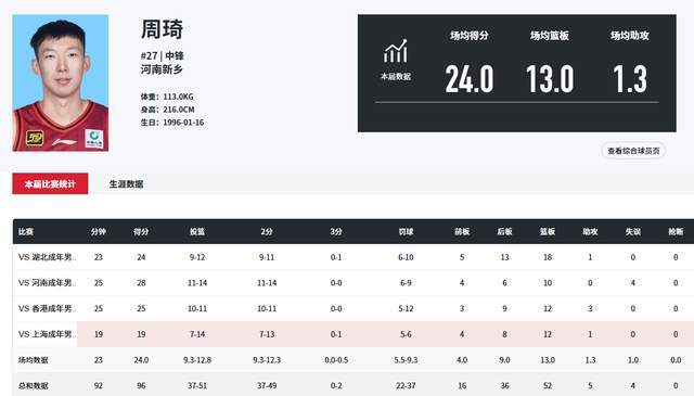 對陣湖北隊(duì),周琦打瞭23分鐘,12投9中,10罰6中,砍下24分18籃板,率隊(duì)63分大勝。對陣河南隊(duì),周琦打瞭25分鐘,14投11中,9罰6中,砍下28分10籃板,率隊(duì)24分大勝。對陣香港隊(duì),周琦打瞭25分鐘,11投10中,12罰5中,砍下25分12籃板,率隊(duì)取得33分大捷。對陣上海隊(duì),周琦隻打瞭19分鐘,但依舊十分高效,14投7中,6罰5中,拿下19分12籃板。