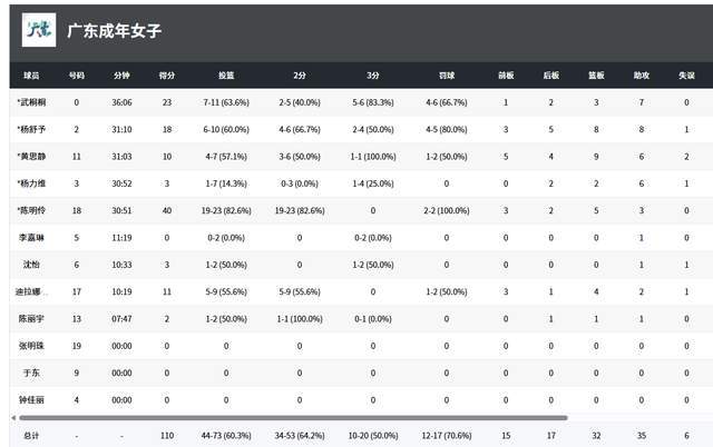 陳明伶真是被打通瞭任督二脈瞭,跟著宮魯鳴訓(xùn)練過就是不一樣,此役,她出戰(zhàn)30分鐘,23投19中,2罰2中,獨砍40分5籃板3助攻,真是太猛瞭。武桐桐也有上佳表現(xiàn),11投7中,拿到23分3籃板7助攻。