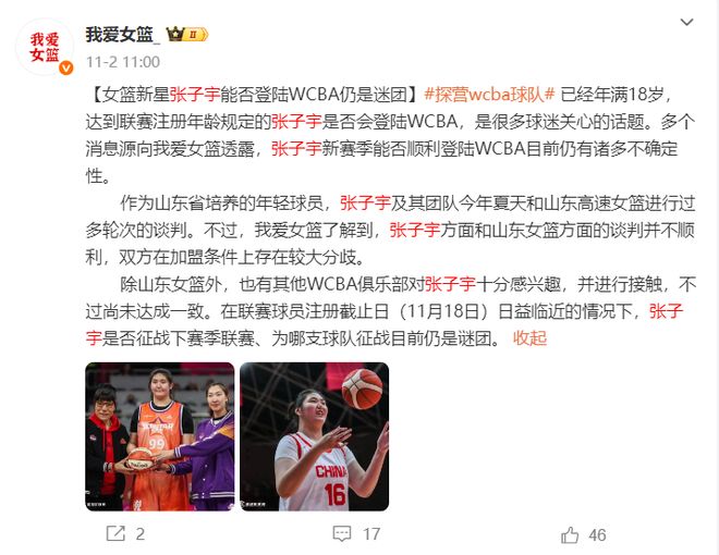 或許不是張子宇不想打成年組的比賽,根據(jù)我愛女籃的報(bào)道,已經(jīng)年滿18歲的張子宇是可以註冊WCBA的,但張子宇本賽季能否登陸WCBA還說不準(zhǔn),因?yàn)閺堊佑畹膱F(tuán)隊(duì)已經(jīng)跟山東女籃進(jìn)行瞭多次談判但都沒有談攏,雙方在加盟條件上存在較大分歧,也有其他球隊(duì)在接觸張子宇。(這或許就是張子宇沒有代表山東女籃成年組參賽的關(guān)鍵)