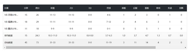 對陣河南U18,15分鐘13中11,罰球6中4,拿到26分3籃板1蓋帽,命中率84.6%;