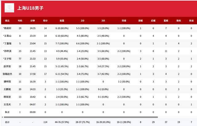 再看人傢上海隊(duì),全隊(duì)7人得分上雙,楊易軒14分7籃板,王青山14分4籃板,丁嘉瑞15分4助攻,孫梓淇13分11籃板,王子恒13分3籃板,趙羿澎15分3籃板,張懿趙傑17分4籃板。