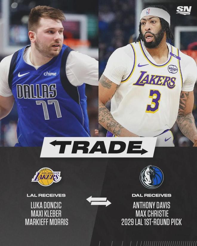 上賽季的季中交易截止日之前,小牛主動(dòng)聯(lián)系湖人,最終達(dá)成瞭3換3的驚天大交易:湖人得到東契奇、大莫裡斯和克萊伯,小牛得到濃眉、克裡斯蒂和2029年的首輪簽。