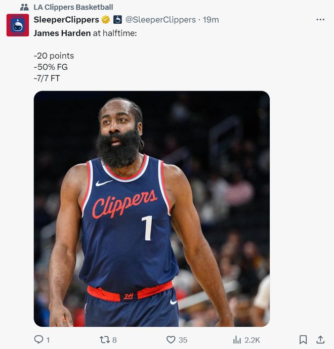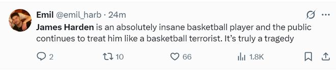 半場打完後美記:哈登是一位極其出色的籃球選手,但公眾卻一直把他當做籃球界的恐怖分子來對待,這實在是令人心痛。