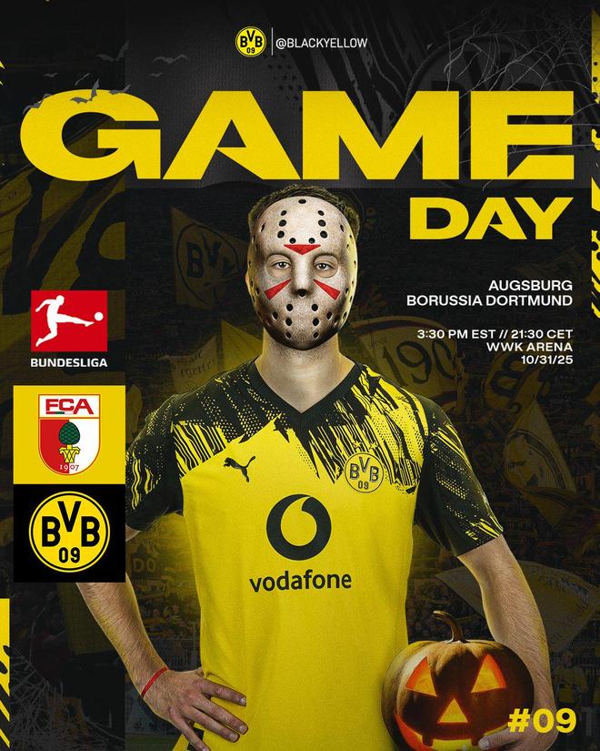 雷速體育10月30日訊 德甲第9輪多特客戰(zhàn)奧格斯堡的比賽將在當?shù)貢r間的萬圣夜上演,賽前多特官方也發(fā)布了特殊海報預熱。