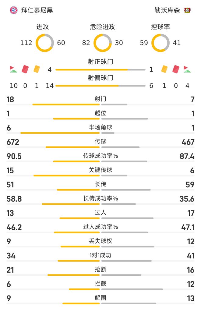 拜仁完勝藥廠!4射正進(jìn)3球效率極高,控球率近六成