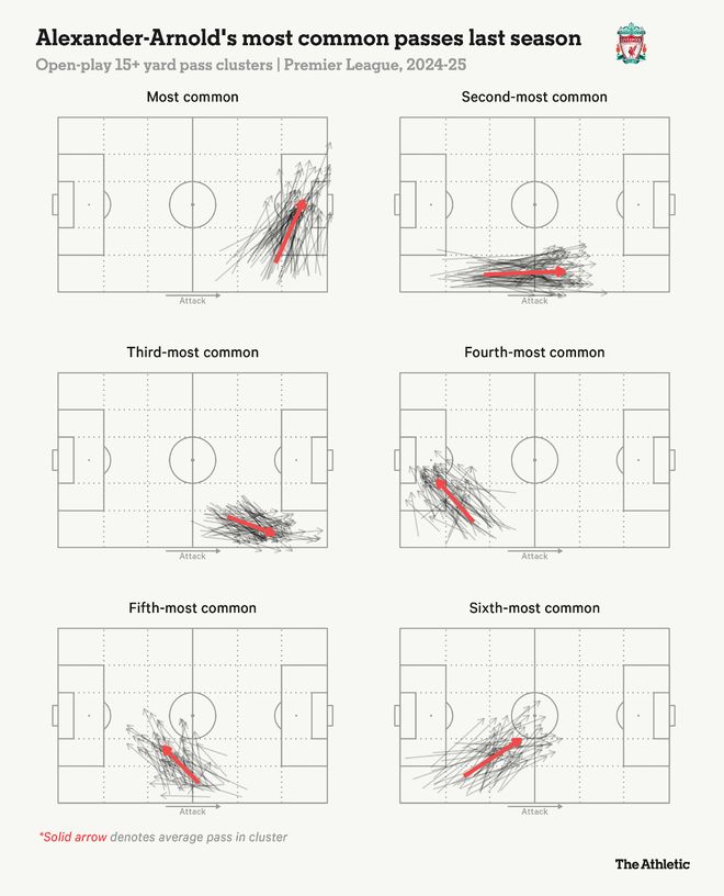 下圖突顯瞭阿諾德上賽季最頻繁的長傳(超過15碼),展示瞭那些快速傳中對(duì)禁區(qū)內(nèi)的威脅。