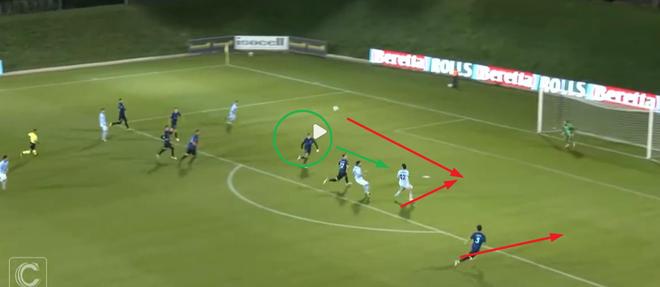 第83分鐘,中路貝倫佈魯赫持球一路梅西式狂奔,面對多人包夾將球分給右路後插上的、剛剛上場首次觸球的阿博尼福,後者在無人幹擾的情況下傳出一記讓狗哥驚掉下巴的傳中球,精準找到中路包抄、同樣是剛剛上場的托帕洛維奇,後者頭錘攻門送出國際米蘭U23本場比賽的第二腳射正球門范圍內的射門,並將比分成功反超!