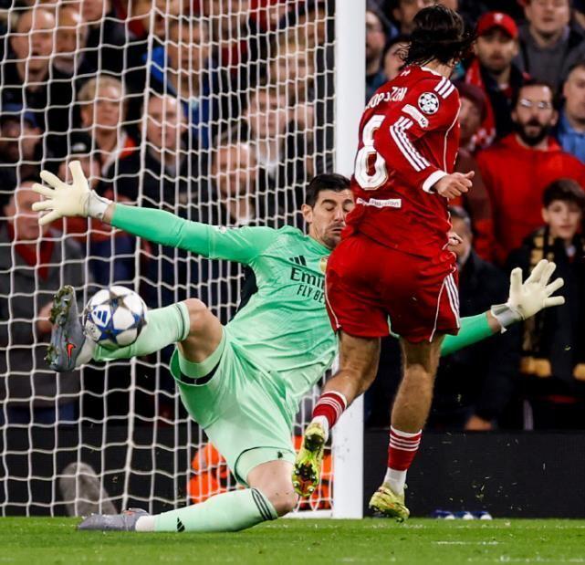 比賽從一開始就進入了利物浦熟悉的快節(jié)奏。上半場,利物浦中場索博斯洛伊便成為皇馬防線的噩夢。他先是機敏包抄搶點,被庫爾圖瓦反應(yīng)神速用腳擋出;隨后又一腳勢大力沉的遠射,再次被這位比利時門神飛身化解。整個上半場,利物浦的進攻一浪高過一浪,而站在他們面前的,仿佛是一堵無法逾越的高墻。