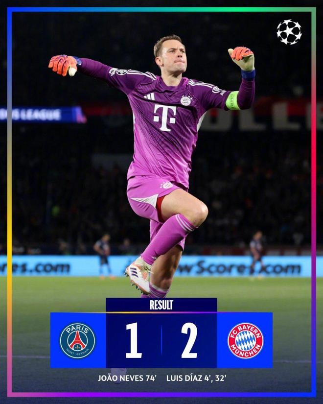 開場僅僅4分鐘迪亞斯補射破門,拜仁1-0取得夢幻開局。第32分鐘迪亞斯前場搶斷后突入禁區(qū)推射破門,拜仁2-0擴大了領(lǐng)先優(yōu)勢。半場補時階段,迪亞斯兇狠犯規(guī)被紅牌罰下。第74分鐘若昂-內(nèi)維斯門前包抄破門,幫助大巴黎扳回1球。