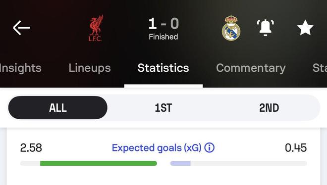 北京時間11月5日,在歐洲冠軍聯(lián)賽階段第4輪的對決中,利物浦以1-0戰(zhàn)勝皇家馬德里。賽后,知名統(tǒng)計機構Sofascore Football給出了皇馬的預期進球,皇馬最近四年歐冠對陣英超球隊預期進球都是最低的。
