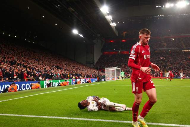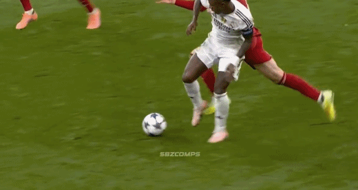 利物浦禁區(qū)之內(nèi),維尼修斯90度變向,布拉德利也迅速轉(zhuǎn)身防守。維尼修斯假摔騙點(diǎn),未能騙過裁判;