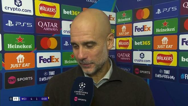 率隊(duì)在歐冠聯(lián)賽階段第4輪主場(chǎng)4-1大勝多特蒙德之后,曼城主教練瓜迪奧拉接受了來(lái)自TNT體育的采訪。