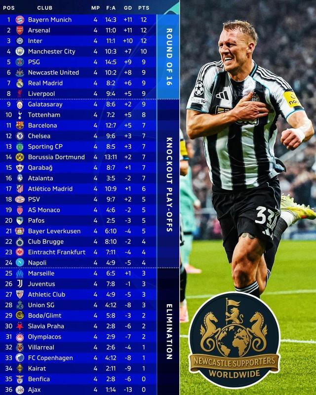 歐冠聯(lián)賽階段第4輪,紐卡主場(chǎng)2比0畢爾巴鄂,丹·伯恩首開(kāi)紀(jì)錄,若埃林通鎖定勝局,托納利當(dāng)選MVP。喜鵲3勝1負(fù)排名第6,與巴黎、利物浦、皇馬同分。 本季歐冠英超球隊(duì)8次出戰(zhàn)西甲球隊(duì),以7勝1負(fù)占?jí)旱剐詢?yōu)勢(shì)。紐卡的勝利宣告英超6支歐冠參賽隊(duì)本輪5勝1平的強(qiáng)勢(shì)。在前4輪24場(chǎng)比賽中,英超球隊(duì)17勝4平3負(fù),在前4、前8、前10、前12均占半壁江山。其中阿森納(4勝)、曼城(3勝1平)、熱刺(2勝2平)保持不敗。阿森納進(jìn)11球失0球,與拜仁并列榜首,下輪兩隊(duì)將直接對(duì)話。