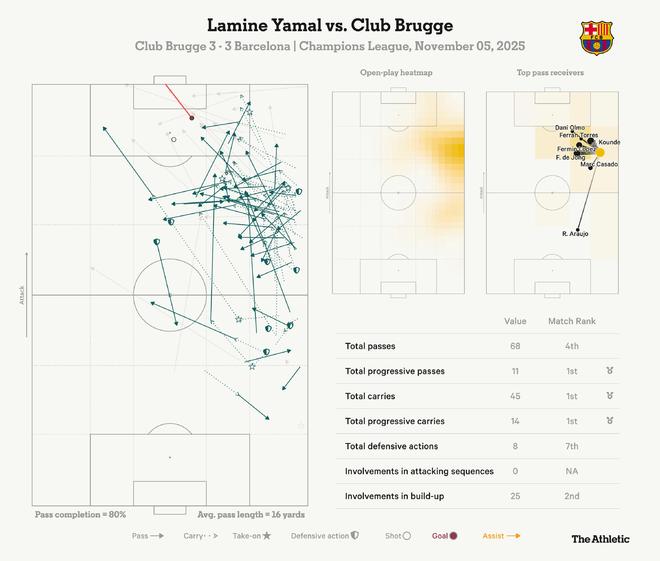亞馬爾下一步觸球順勢(shì)而入,沖過(guò)佈魯日中後衛(wèi)梅切萊深入禁區(qū)。傑克爾斯迅速出擊以縮小角度,但亞馬爾冷靜地將球繞過(guò)門(mén)將送入網(wǎng)窩。
