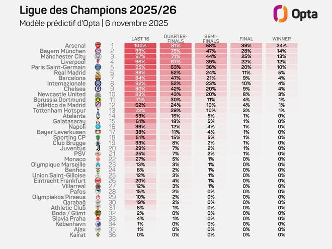 北京時間11月6日,在歐冠聯(lián)賽階段第4輪的比賽結(jié)束後,Opta預(yù)測瞭36支參加球隊晉級16強、1/4決賽、半決賽、決賽以及奪冠的概率。
