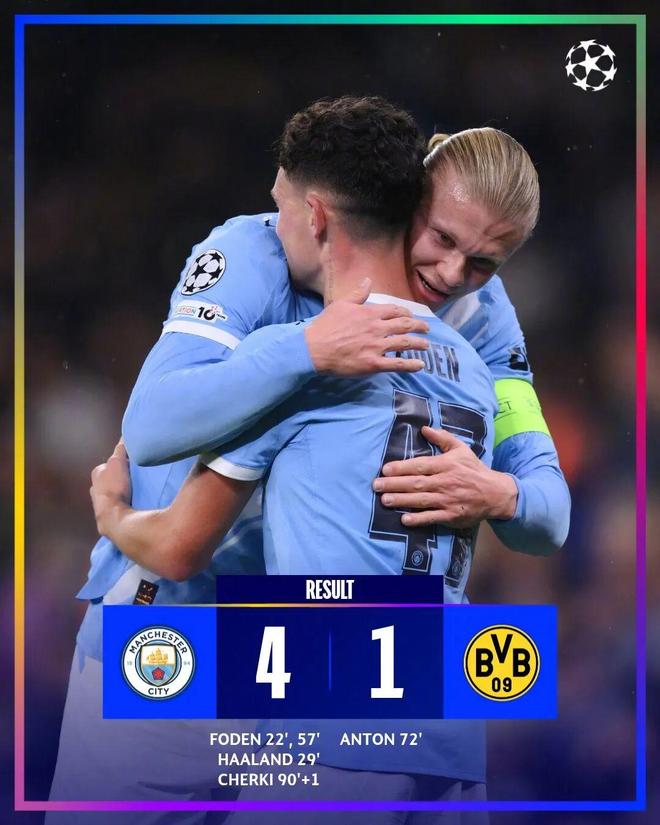 最終曼城4-1大勝多特,曼城4輪3勝1平不敗,積10分暫居第4,多特7分第14。