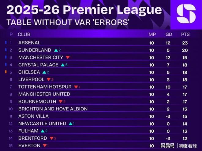 有趣的是,著名數(shù)據(jù)分析網(wǎng)站Squawka,統(tǒng)計(jì)了關(guān)于去除VAR爭議判罰的積分榜,阿森納仍高居第一,桑德蘭則上升到第二名,曼聯(lián)是為數(shù)不多名次沒有改變的球隊(duì),是不是意味著,桑德蘭遭遇了更多不利判罰。