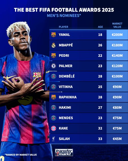 FIFA最佳球員候選身價(jià):亞馬爾2億領(lǐng)跑 薩拉赫凱恩墊底