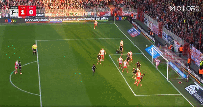 第9分鐘,柏林聯(lián)合前場(chǎng)左側(cè)開出角球,前點(diǎn)后點(diǎn)兩次頭球接力之后,安薩門前頭球破門。隨后VAR介入,判罰安薩體毛級(jí)越位在先,進(jìn)球無(wú)效。