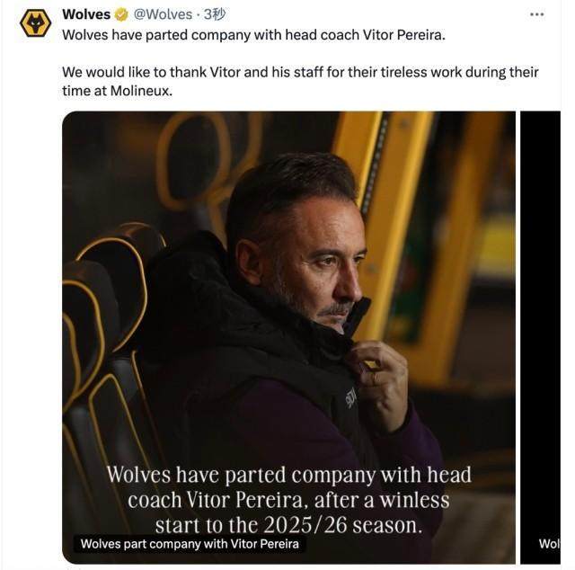 狼隊(duì)官宣主帥佩雷拉下課:“狼隊(duì)與主教練維托爾·佩雷拉分道揚(yáng)鑣。我們要感謝維托和他的團(tuán)隊(duì)在莫利紐球場(chǎng)工作期間的辛勤付出。”新賽季前10輪,狼隊(duì)2平8負(fù)一場(chǎng)不勝排名墊底,在本輪0比3輸給富勒姆後,俱樂(lè)部決定解除佩雷拉主帥職務(wù)。去年12月佩雷拉上任救火,各項(xiàng)賽事帶隊(duì)38場(chǎng),14勝6平18負(fù),勝率36.84%。佩雷拉是門(mén)德斯經(jīng)紀(jì)公司旗下教練,今年9月,他剛與狼隊(duì)續(xù)約到2028年,不過(guò)據(jù)悉其合同中有特殊條款,使得狼隊(duì)無(wú)需賠償合同內(nèi)的全額薪水。
