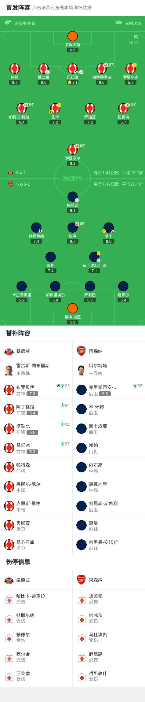 北京時(shí)間11月9日1:30,英超第11輪繼續(xù)進(jìn)行,阿森納作客光明球場挑戰(zhàn)桑德蘭,本場主裁判為克雷格-鮑森。上半場,穆傑萊助攻巴拉德破門。下半場,梅裡諾助攻薩卡扳平比分,特羅薩德世界波助阿森納反超;補(bǔ)時(shí)階段,佈羅貝伊高難度凌空破門絕平。最終,阿森納客場2-2戰(zhàn)平桑德蘭,各項(xiàng)賽事十連勝遭終結(jié)。