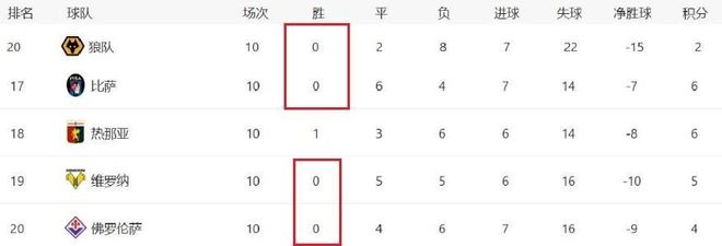 隨著熱那亞和門(mén)興格拉德巴赫兩隊(duì)成功“上岸”,目前本賽季歐洲五大聯(lián)賽賽場(chǎng)上,還剩下4支一勝難求的隊(duì)伍。這四支本賽季歐洲五大聯(lián)賽中0勝球隊(duì),分別是英超的狼隊(duì),以及意甲三支球隊(duì)比薩、維羅納和佛羅倫薩。