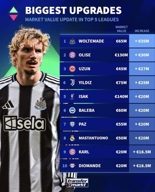 最新一期五大聯(lián)賽球員身價(jià)漲幅榜發(fā)佈 伊薩克這表現(xiàn)能漲2000萬(wàn)?