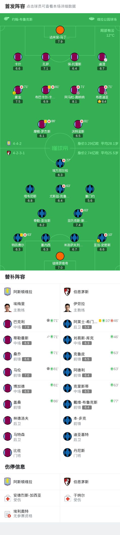維拉4-0伯恩茅斯,大馬丁撲點,佈恩迪亞、奧納納、馬倫破門