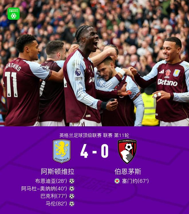 北京時間11月9日22:00,英超第11輪,阿斯頓維拉坐鎮(zhèn)主場迎戰(zhàn)伯恩茅斯。比賽中,佈恩迪亞任意球破門,隨後阿馬杜-奧納納遠射再下一城;下半場,塞門約主罰點球被大馬丁撲出,巴克利、馬倫先後取得進球。最終,阿斯頓維拉以4-0戰(zhàn)勝伯恩茅斯。