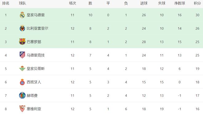 在積分榜上,皇馬以30分領跑,10勝1負的戰(zhàn)績極其出色。比利亞雷亞爾這匹大黑馬超越了巴薩,升到了第2名。比利亞雷亞爾的戰(zhàn)績是8勝2平2負,拿到26分。而巴薩只拿到25分,排名第3。不過,巴薩比比利亞雷亞爾少踢1場。馬競贏球之后,總積分也達到25分,只是因為凈勝球不如巴薩,只能排名第4。皇家貝蒂斯以19分排名第5。第6的是赫塔費,拿到了17分。