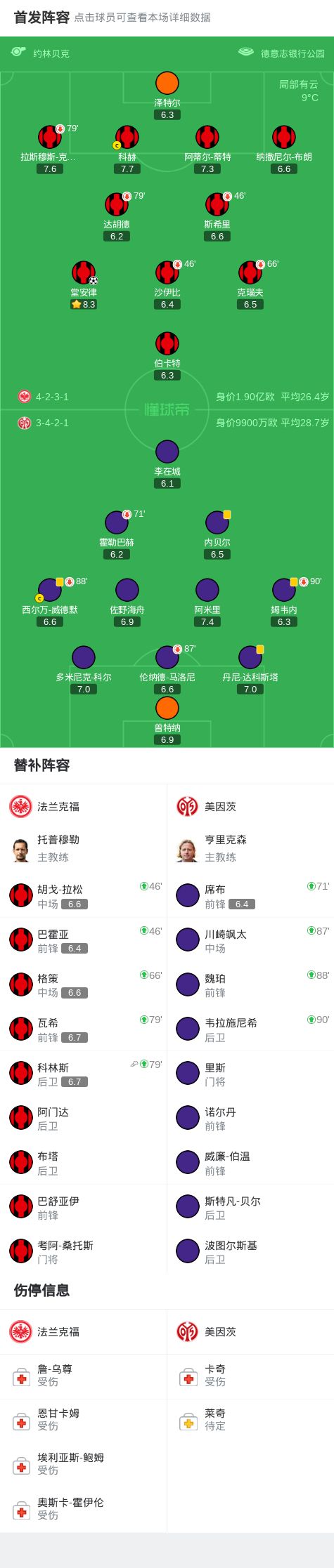 法蘭克福1-0美因茨,堂安律打進(jìn)全場(chǎng)唯一進(jìn)球