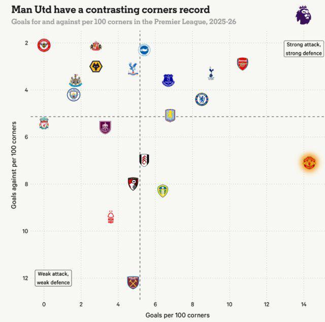 曼聯(lián)的定位球水平行不行?憑印象,你很可能得出“防守很差”的結(jié)論,這也是事實(shí)。但要是論進(jìn)攻,紅魔卻正在成為英超的“角球之王”。上周末絕平熱刺,曼聯(lián)就是靠德利赫特頂進(jìn)角球,而論數(shù)據(jù),他們?cè)谀撤N意義上甚至強(qiáng)於阿森納。據(jù)競(jìng)技網(wǎng)計(jì)算,曼聯(lián)本賽季雖然實(shí)際角球破門數(shù)低於阿森納、切爾西,獲得角球的次數(shù)也偏低,但他們“每100次角球平均進(jìn)球數(shù)”是14.3,位列全聯(lián)盟第一,而“每100次角球的預(yù)期進(jìn)球值”也達(dá)到瞭7.1,在整個(gè)英超可排第二。