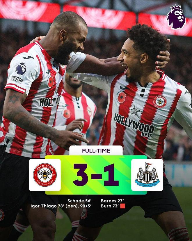 隨後,沙德頭球破門扳平比分,丹-伯恩送點後染紅離場。伊戈爾-蒂亞戈梅開二度幫助佈倫特福德鎖定勝局。最終,佈倫特福德3-1逆轉(zhuǎn)戰(zhàn)勝紐卡。