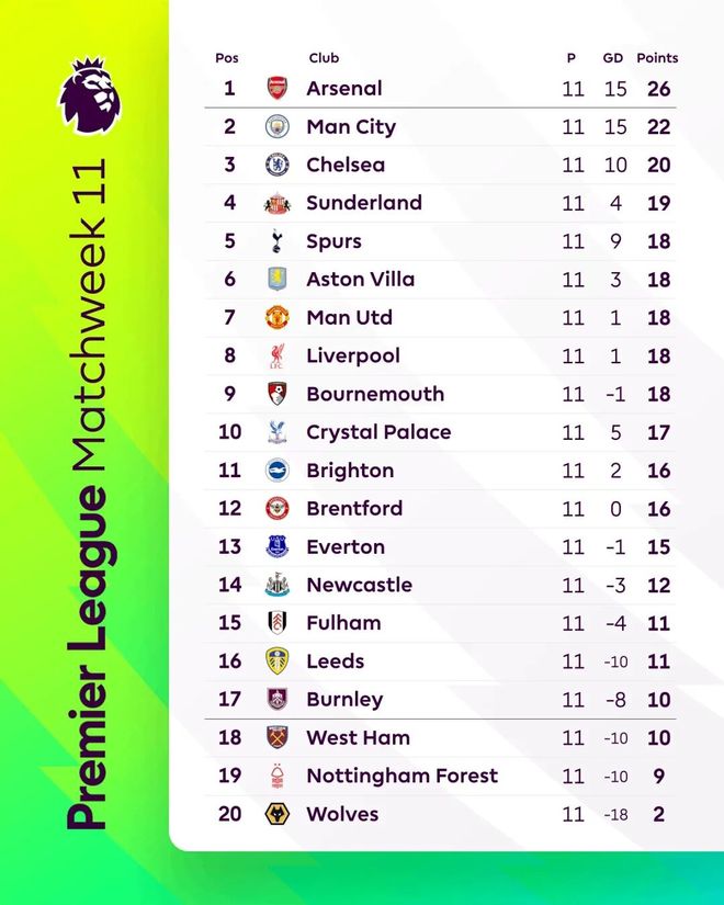 本輪過後,目前槍手依然領(lǐng)跑英超積分榜,曼城落後4分位居第二位,切爾西20分排在第3名,桑德蘭19分排在第4位,從第5名到第9名的球隊,全部積18分,競爭異常激烈。
