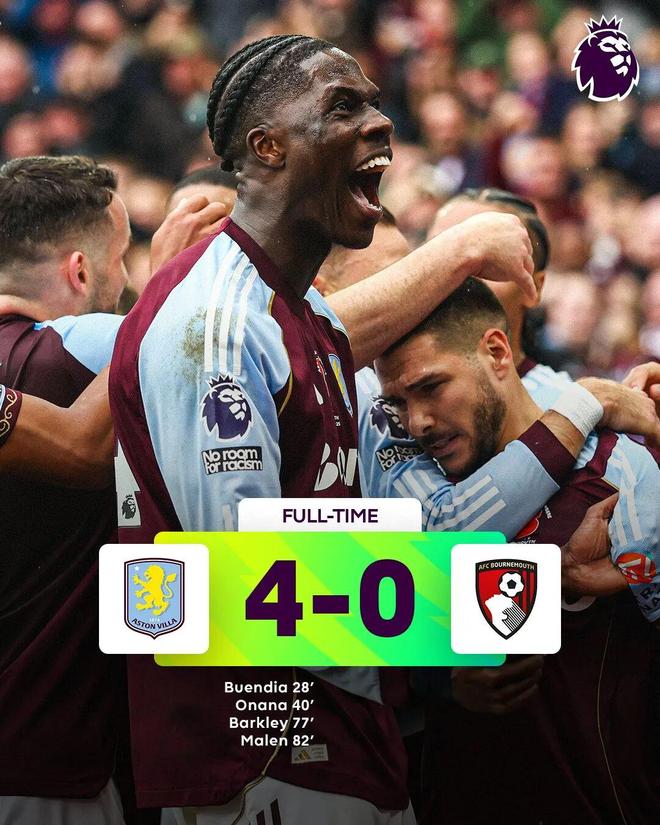 易邊再戰(zhàn),塞門約主罰點球被大馬丁撲出,隨後,巴克利、馬倫先後取得進(jìn)球。最終,維拉4-0大勝伯恩茅斯。