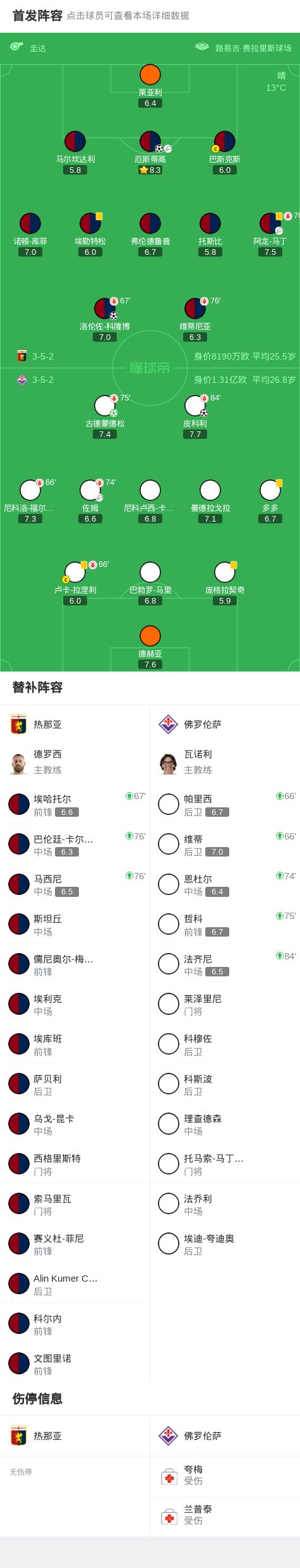 熱那亞2-2佛羅倫薩,德赫亞撲點(diǎn)+失誤送禮,皮科利破門(mén)