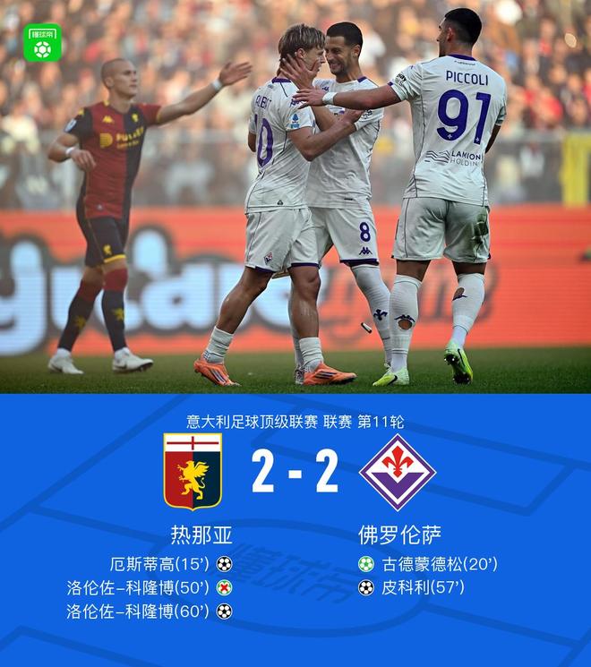 北京時(shí)間11月9日22:00,意甲第11輪展開(kāi)角逐,熱那亞坐鎮(zhèn)主場(chǎng)迎戰(zhàn)佛羅倫薩。比賽開(kāi)局階段,厄斯蒂高頭球破門(mén),古德蒙德松主罰命中,將比分扳平;下半場(chǎng)伊始,科隆博主罰點(diǎn)球被德赫亞撲出,隨後皮科利幫助球隊(duì)反超比分,但德赫亞失誤送科隆博攻入一球。最終比分定格在2-2,最終雙方握手言和,各取一分。